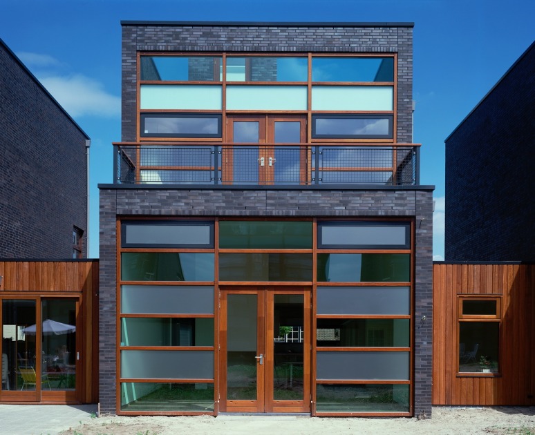 The 16 private dwellings in Breda are built according to the split level principle. This means that the living room is 3,8 m high. This high room has a wooden curtain facade towards the garden.